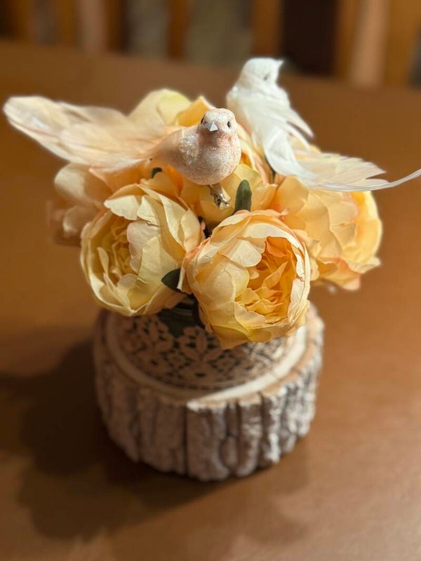 Articolo decorativo per casa in legno e vetro con fiori sintetici e uccelli in materiale sintetico