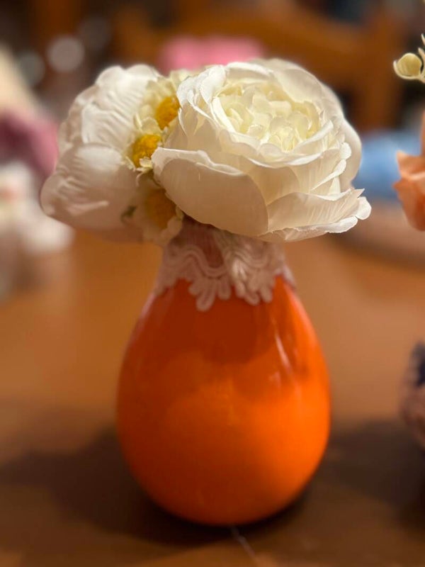 Articolo decorativo piccolo in porcellana colorata con fiori in plastica